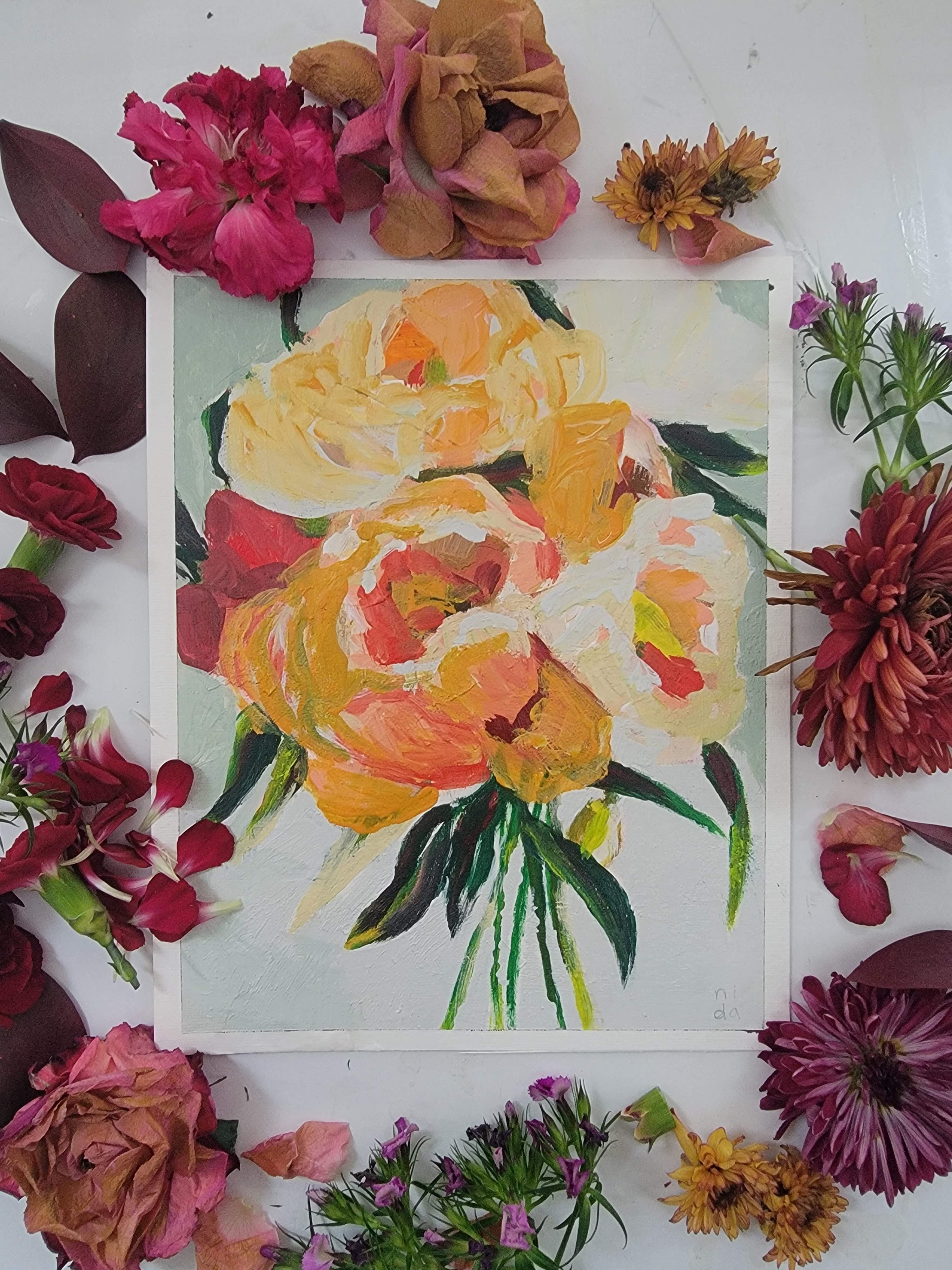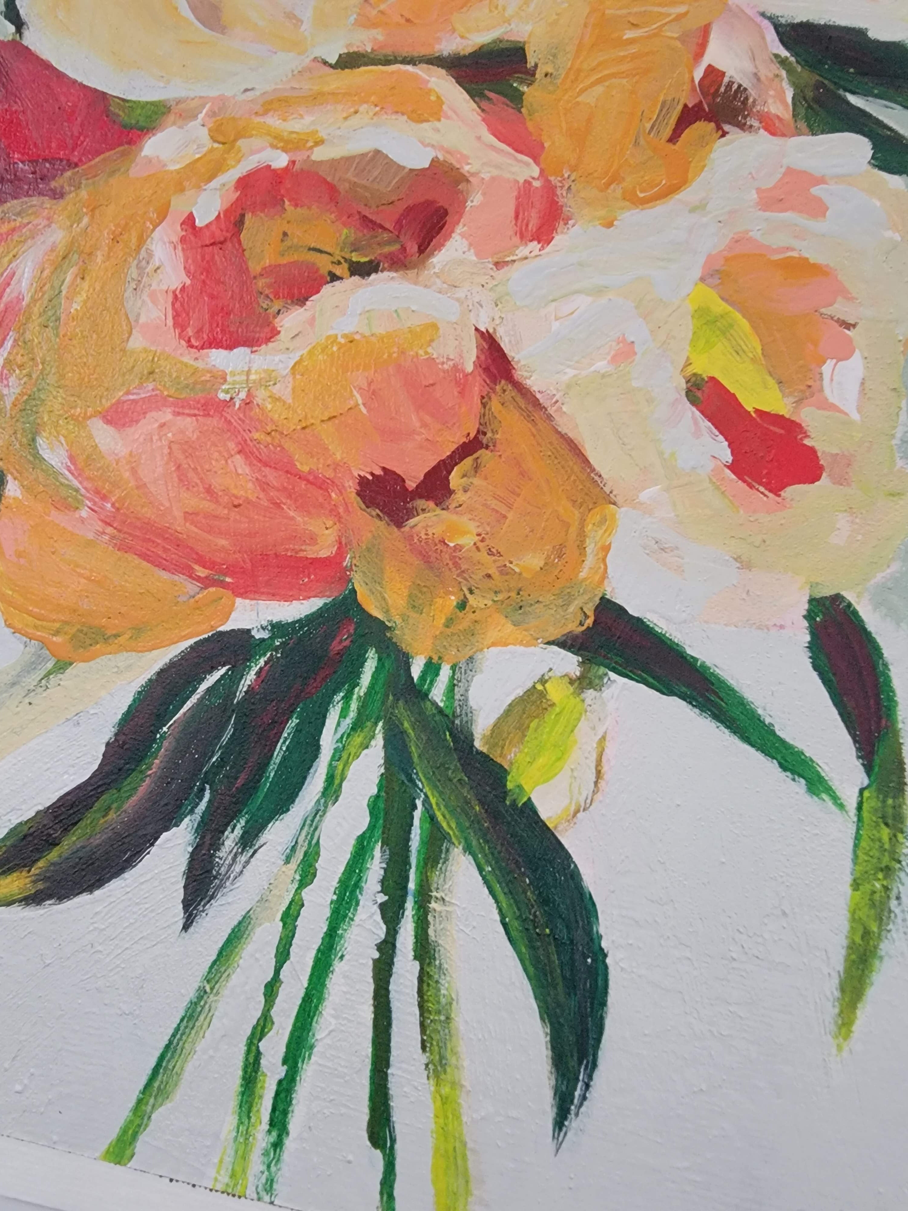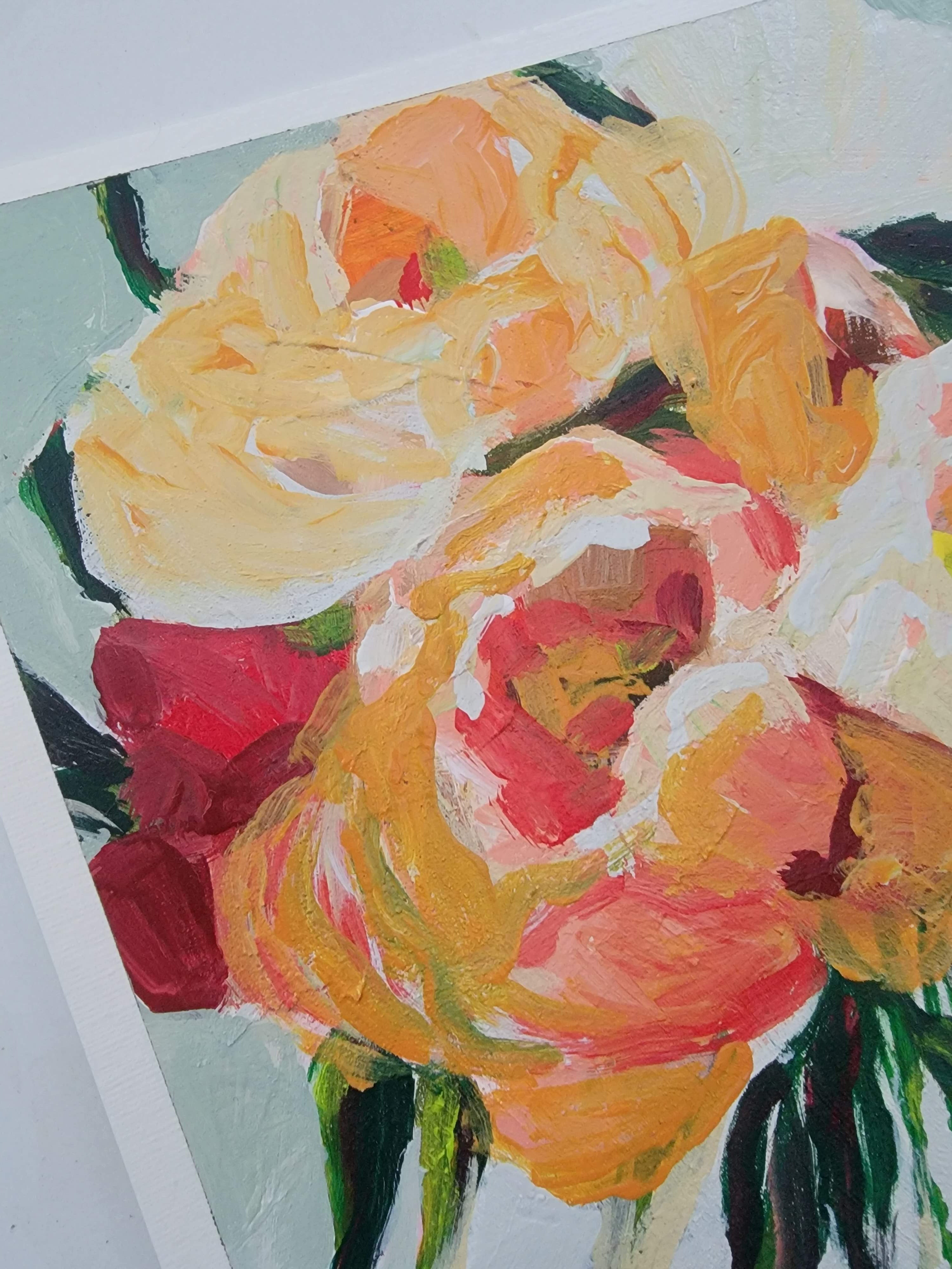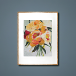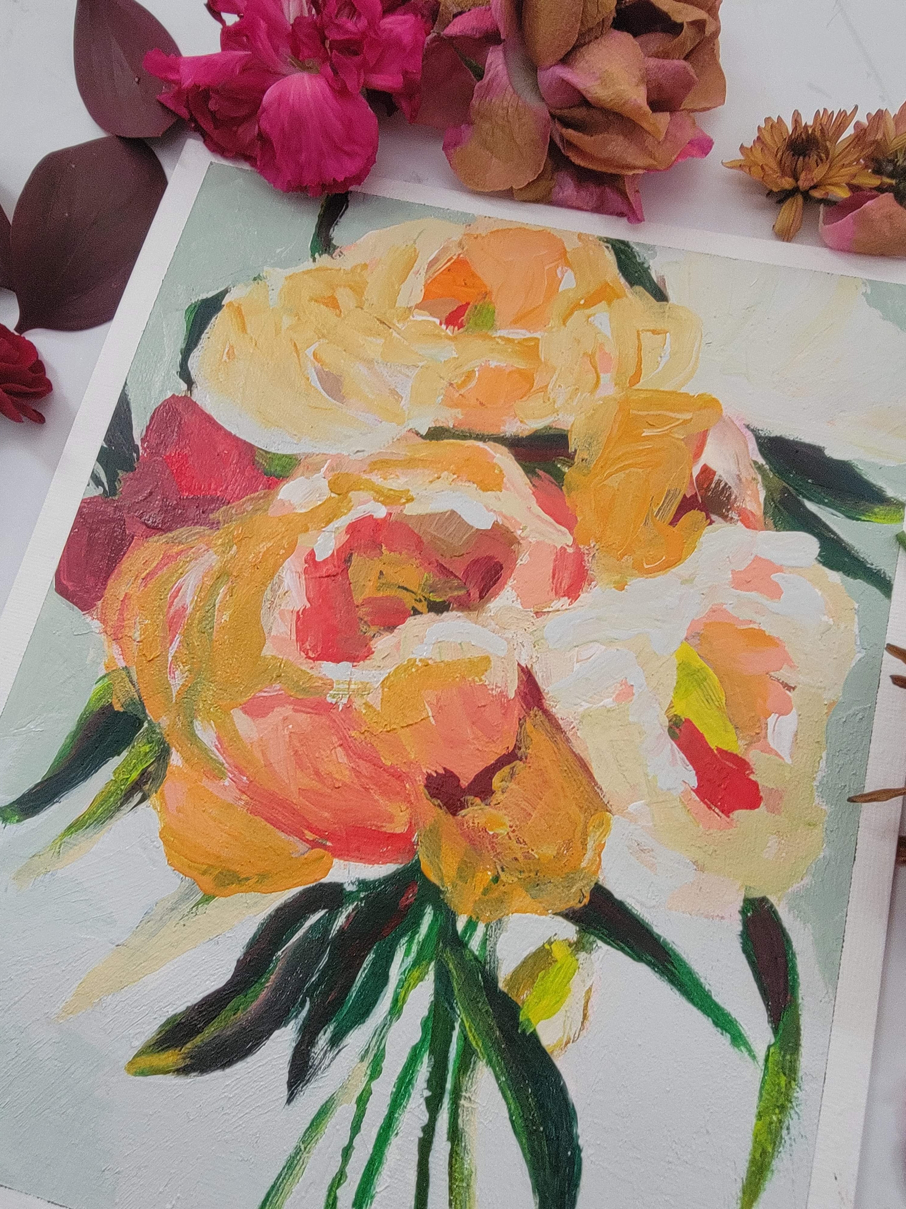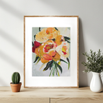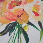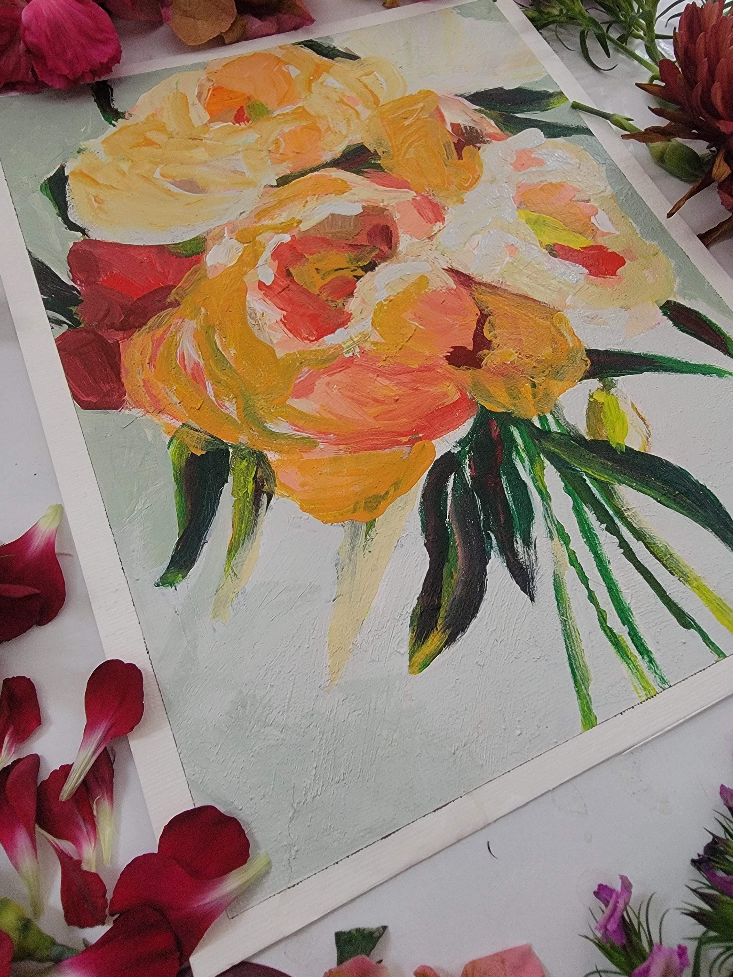 Bathed in golden light, Golden Blooms captures the fleeting beauty of peonies at their peak. Lush strokes of yellow, coral, and cream unfold like petals basking in late afternoon sun, while deep green leaves ground the composition with grace. Painted with a palette knife, each textured layer whispers of movement, a bouquet alive with warmth, radiance, and quiet joy.